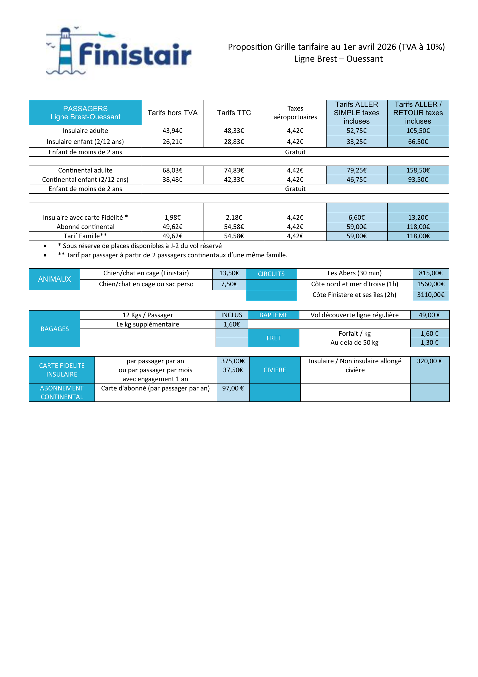 FINISTAIR a signé avec la région Bretagne une convention de Délégation de Service Public pour la ligne Brest - Ouessant. Les vols sont assurés du lundi matin au samedi midi.